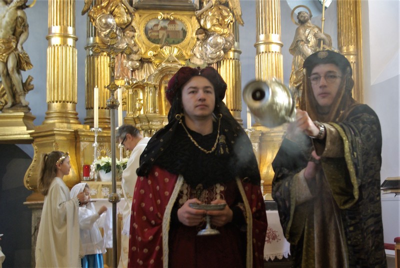 Sehr gut besucht war der Gottesdienst am 6. Januar um 10.00 Uhr, am Hochfest „Erscheinung des Herrn“. Das lag auch an der begründeten Erwartung, dass ebenso in diesem Jahr das traditionelle Dreikönigsspielt aufgeführt werde. Das Hochfest „Erscheinung des Herrn“ unterstreiche, dass Jesus als Messias für alle Völker zur Welt gekommen sei, erklärte Pater Beniamin zu Beginn des Gottesdienstes. Im Anschluss nahm Pater Beniamin die Segnung von Dreikönigswasser, Salz, Kreide und Weihrauch vor.