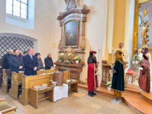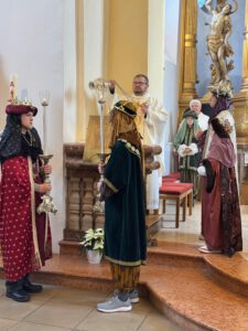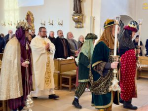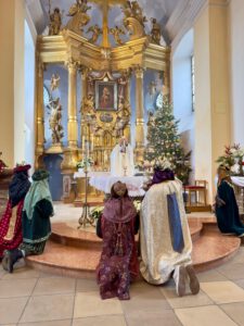 Viele Gläubige besuchten den 10.00 Uhr-Gottesdienst am Hochfest der Erscheinung des Herrn in der Wallfahrtskirche Mariahilf. Besonders eindrucksvoll war, dass der Zelebrant nicht von Ministranten, sondern von drei Königen aus dem Morgenland mit Gefolge begleitet wurde. Zu Beginn erinnerte Pater Zbigniew an das Wagnis der Sterndeuter, die sich auf eine unsichere Reise einließen und im göttlichen Kind den „Schatz ihres Lebens“ fanden. Er ermutigte die Gläubigen, Christus in der Eucharistie zu begegnen und ihm alle Anliegen anzuvertrauen.