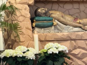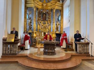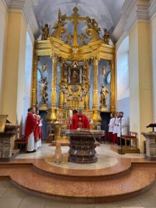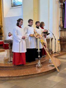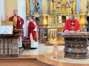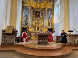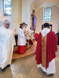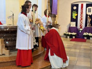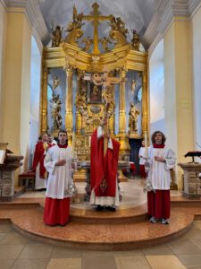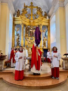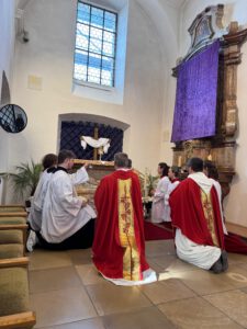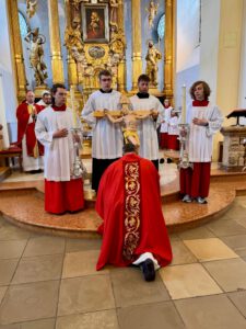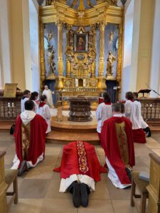 Die Liturgie selbst begann in Stille. Die Zelebranten – Hauptzelebrant Pater Jakob und die Konzelebranten Prof. Dr. Dr. Stefan Mückl und Pater Zbigniew – zogen mit den Ministranten in die Kirche ein und warfen sich als Zeichen tiefster Ehrfurcht und Trauer vor dem abgeräumten Altar auf den Boden.
