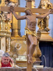 Nach den Großen Fürbitten wurde das Kreuz feierlich enthüllt und zur Verehrung erhoben. Die Gläubigen legten Blumen zu Füßen des Kreuzes nieder. Zur Kommunion wurde das Allerheiligste zum Altar übertragen und nach der Kommunionausteilung in einer Prozession in die Seitenkapelle gebracht, wo die Gläubigen bis 20.00 Uhr zur stillen Anbetung verweilen konnten.